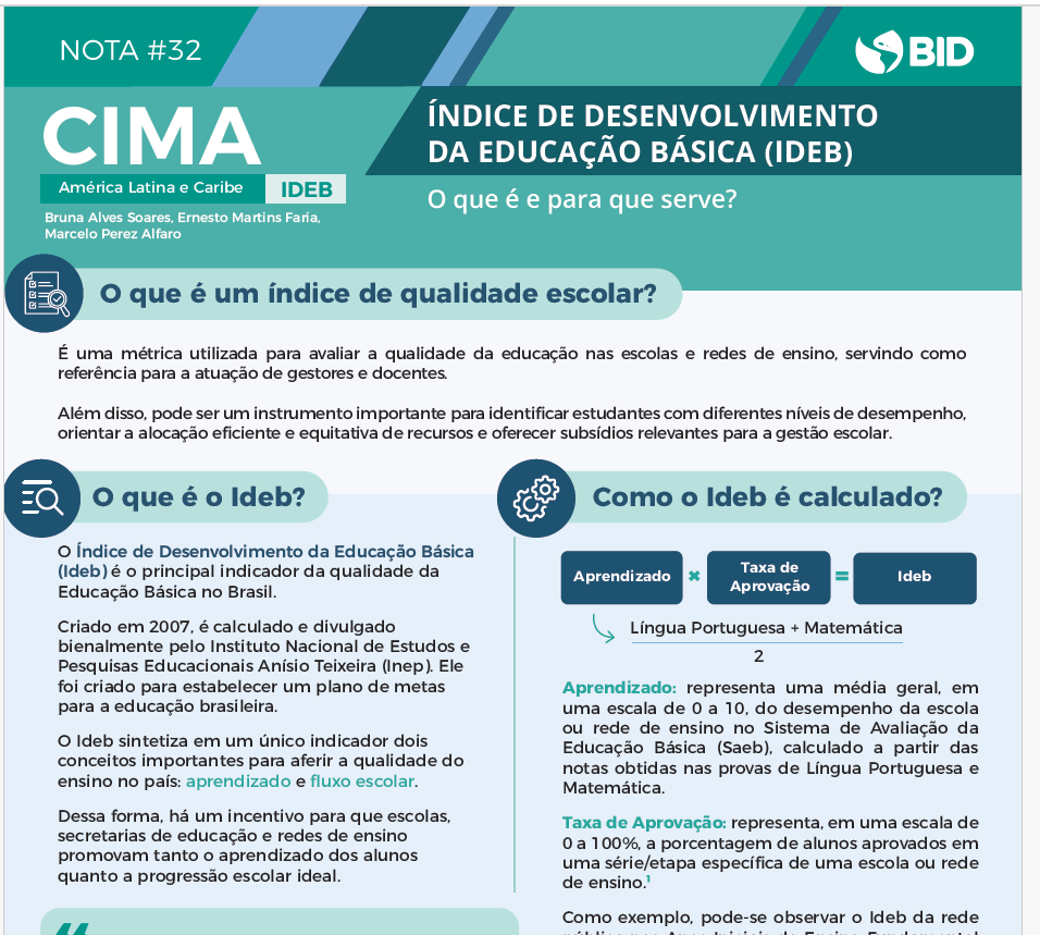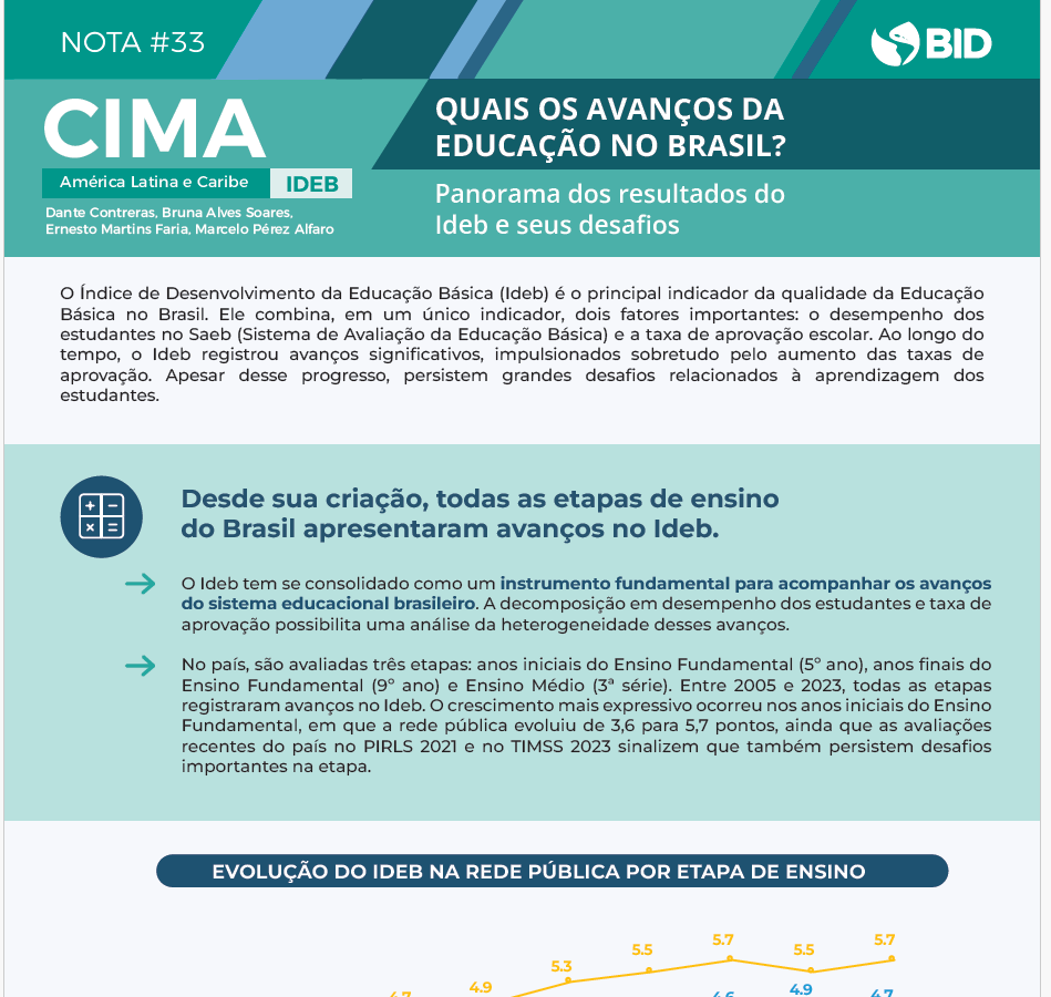 Além das Notas CIMA, Reynaldo Fernandes, criador do Ideb, também publicou um artigo sobre o tema no blog Enfoque Educación, do BID. Em seu texto, ele ressalta que, mais do que uma métrica, o Ideb se tornou uma referência central para orientar políticas, definir metas e monitorar o progresso na qualidade da Educação Básica no Brasil. Ao analisar os avanços e desafios do índice, ele ressalta o que essa experiência pode ensinar a outros países da América Latina e do Caribe: “O Ideb ilustra o papel estratégico que indicadores bem elaborados desempenham na tomada de decisões e na busca por maior equidade e qualidade na educação” (leia o artigo – em espanhol).