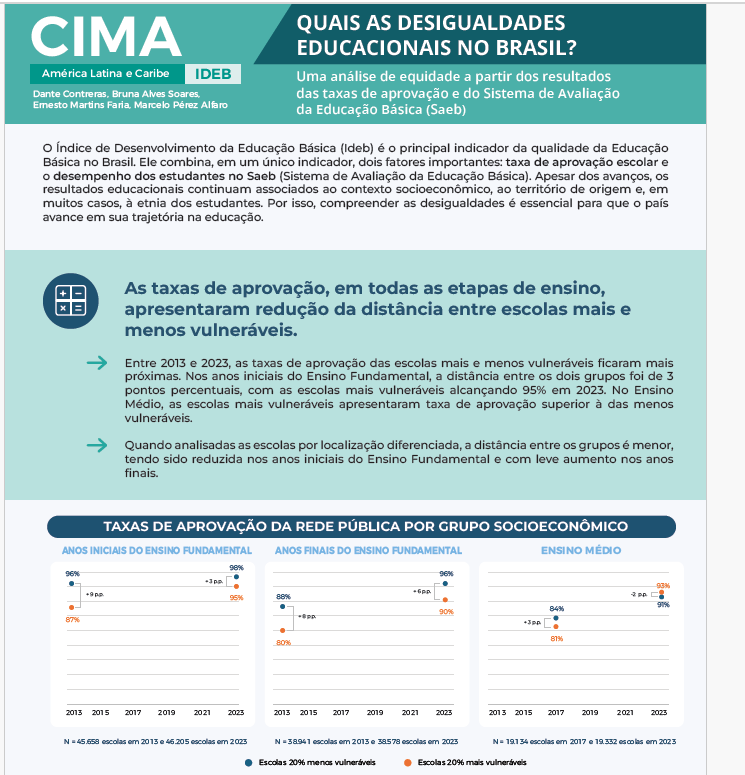 Apesar dos avanços nas taxas de aprovação e nas avaliações nacionais, os resultados educacionais do Brasil continuam associados ao contexto socioeconômico, ao território de origem e, em muitos casos, à etnia dos estudantes. Dados recentes mostram redução da distância entra escolas mais e menos vulneráveis, mas a persistência das desigualdades. A Nota ainda compara os dados do Brasil com os da região da Amazônia Legal.