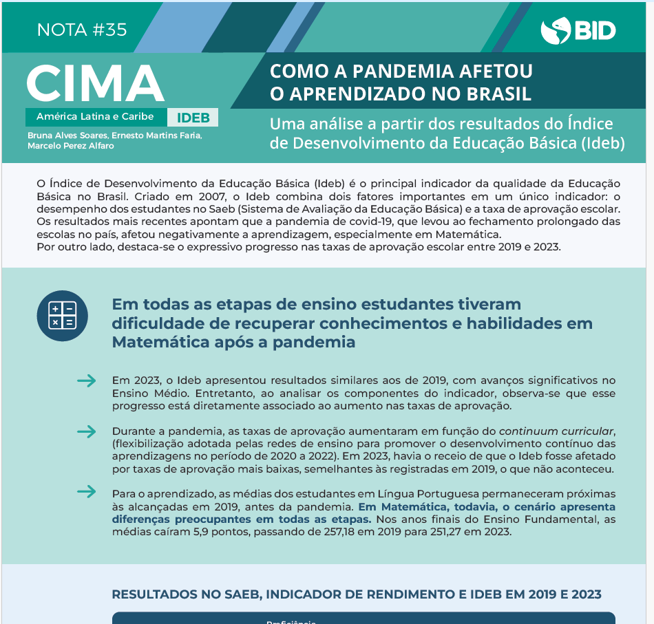 Em parceria com o Banco Interamericano de Desenvolvimento (BID), o Iede elaborou quatro Notas CIMA – resumos temáticos com análises de indicadores educacionais. As Notas tratam dos resultados do Ideb, incluindo os avanços da educação no País, as desigualdades educacionais brasileiras e as consequências da pandemia na aprendizagem dos nossos estudantes. As notas podem ser acessadas em português ou espanhol (os links estão listados abaixo).
